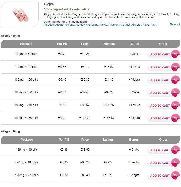 Det säljs under många andra namn : Allegra, Altifex, Fexofenadin Apofri, Fexofenadin Cipla, Nefoxef, Telfast, Fexofenadine Docpharma, Fexofenadin Sandoz.